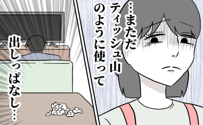 ある日、テレビを見ながら無尽蔵にティッシュペーパーを使っていたコウスケさん。使ったまま放置されたティッシュを見たユラさんは……?
