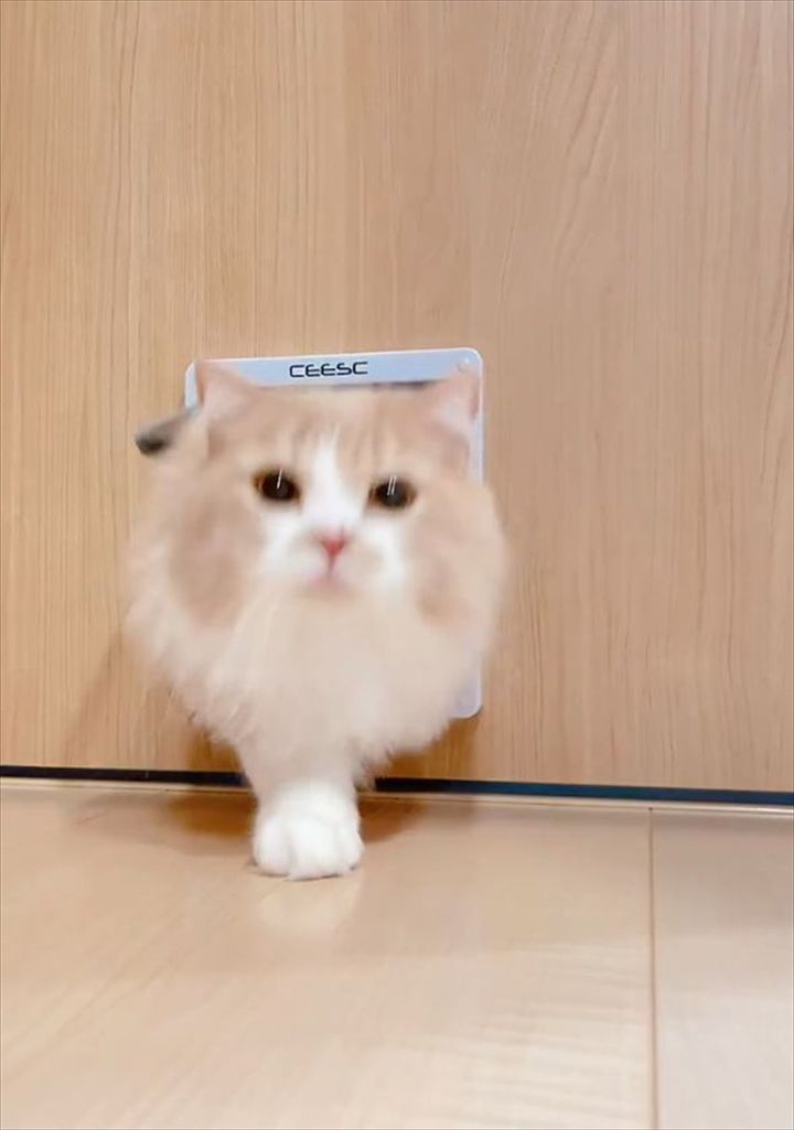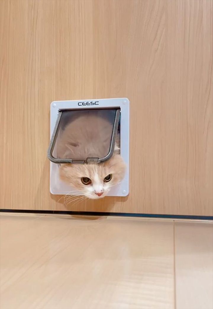 ペットドアを初めてくぐるネコがかわいすぎると話題に「何度も見たくなる」「最初に顔だけ出すとこがもう」