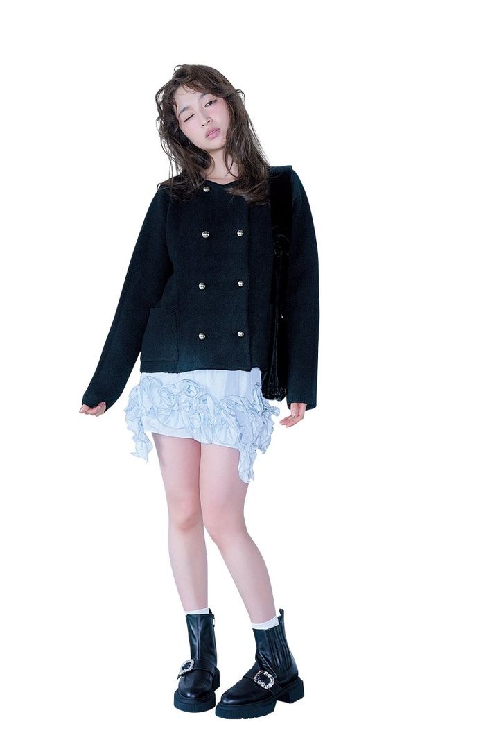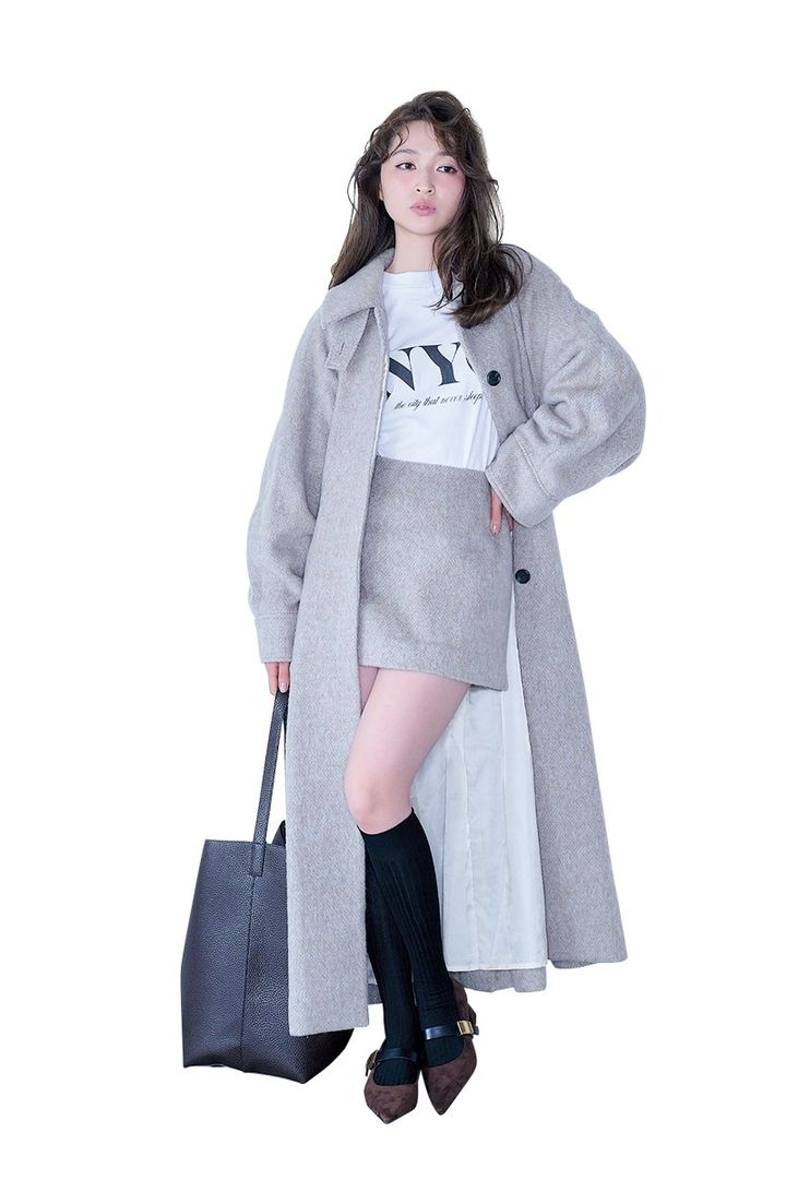 上西星来。ar1.2月合併号より パンプス¥10,500/チャールズ&キー ス(チャールズ&キース ジャパン) ソックス¥990/靴下屋(タビオ) ロ ングコート¥71,500、ミニスカート ¥24,200/ロザリームーン(ロザリ ー) 中に着たTシャツ¥14,850/ア ラミンタ ジェームス、バッグ¥16,500 /ペタ アンド ジェイン(ジャック・オ ブ・オール・トレーズ プレスルーム)
