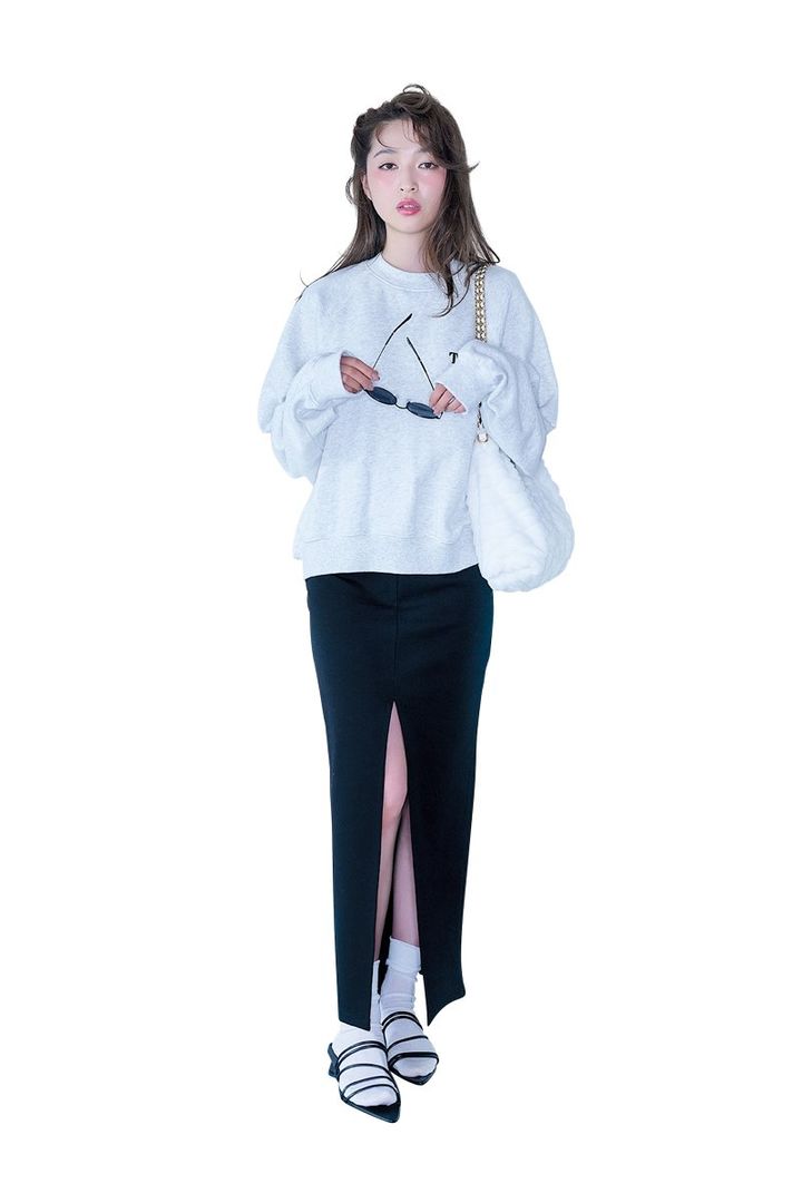 上西星来。ar1.2月合併号より ミュール¥2,790/神戸レタス ソックス¥ 990/靴下屋(タビオ) スウェット¥17,000/ TW スリットスカート¥28,600/シー(エス ストア) サングラス¥12,100/ペタ アンド ジェイン(ジャック・オブ・オール・トレーズ プレスルーム) バッグ¥17,900/チャールズ &キース(チャールズ&キース ジャパン)