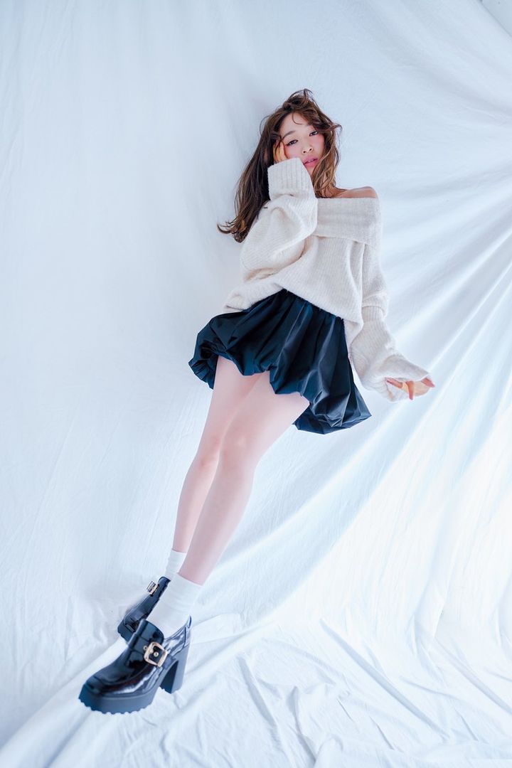 上西星来。ar1.2月合併号より ニット¥31,900/シーエ(ルー プ トーキョウ) スカート¥27,500/ロザリームーン(ロザリー) ソックス¥990/靴下屋(タビオ) ボリュームローファー¥21,450/ダイアナ(ダイアナ 銀座本店)