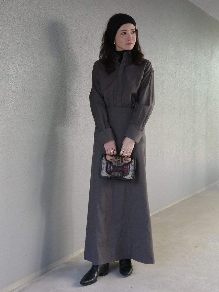 ヘアバンド¥11,000(エントワフェイン)、ニューナウのシャツとスカート、スタニングルアーのトップス、ピエールアルディのバッグとブーツ、その他は全て本人私物