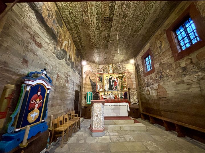 説教台にはモーゼの十戒が描かれ、祭壇は聖レオナルド、最後の審判、最後の晩餐をテーマにした3つのエリアで構成されています。また、背面ミサが行われていた珍しい形の教会として知られています。