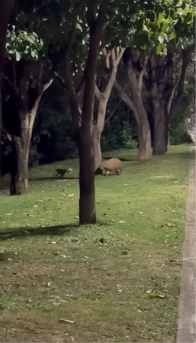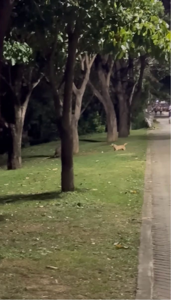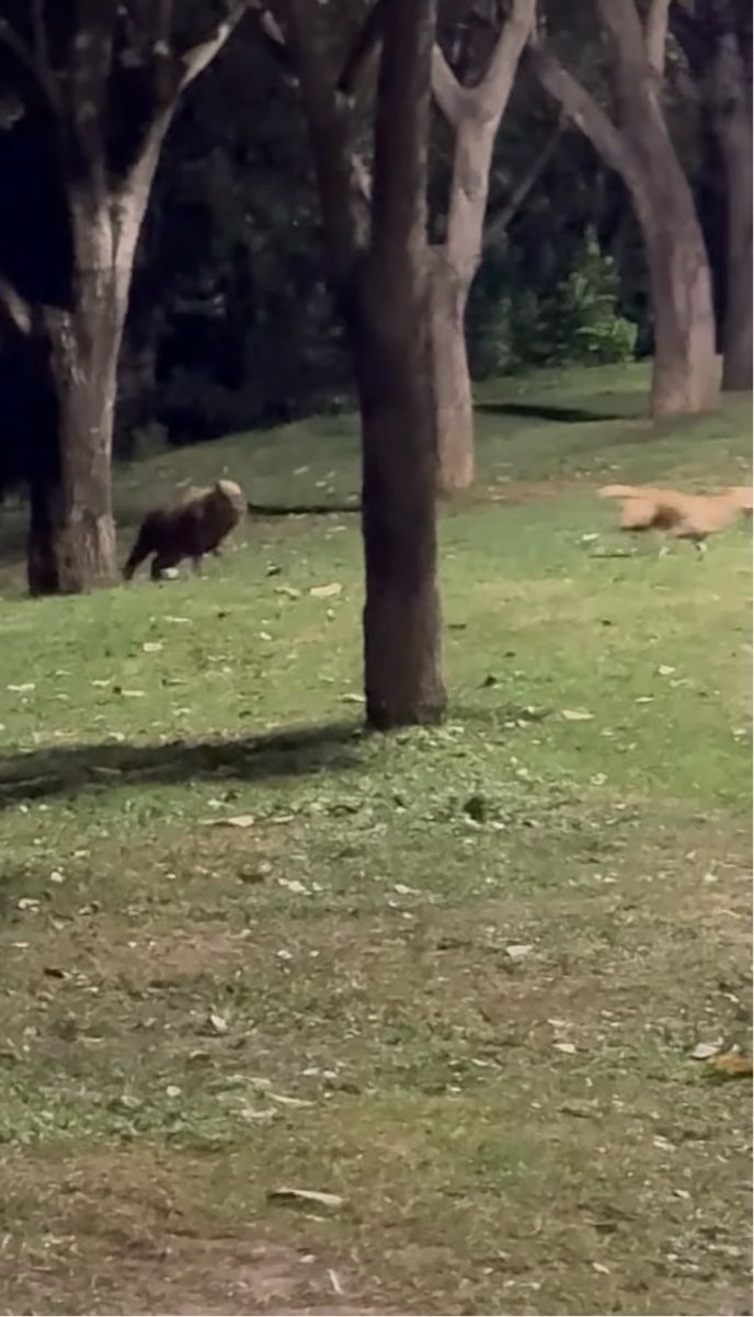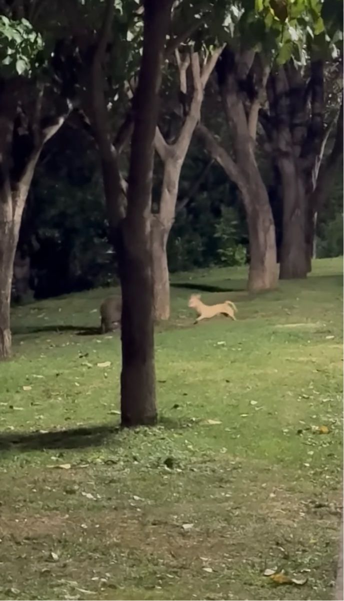夜道を歩いていた撮影者さんは、イヌが追いかけっこをしているところに遭遇しました。