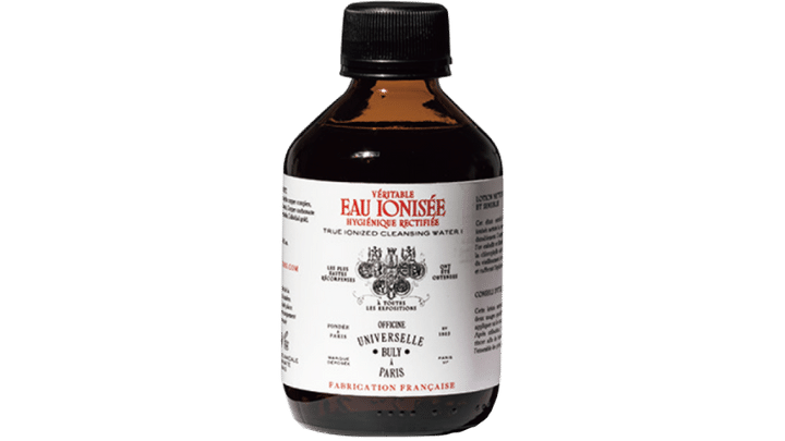 その日の気分でヒアルロン酸のパウダーを入れたBULYのクレンジングウォーターで拭き取りも。イオナイズド・クレンジングウォーター・シングル 200mL ¥5,060(オフィシーヌ・ユニヴェルセル・ビュリー)