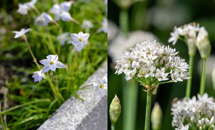 ハナニラ(左)とニラの花(右)。Bowonpat Sakaew、Tom Meaker/Shutterstock.com