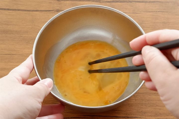 4. ボウルに卵を割り入れ、箸やフォークで溶きほぐす。卵を切るように、箸を左右に動かしてください。