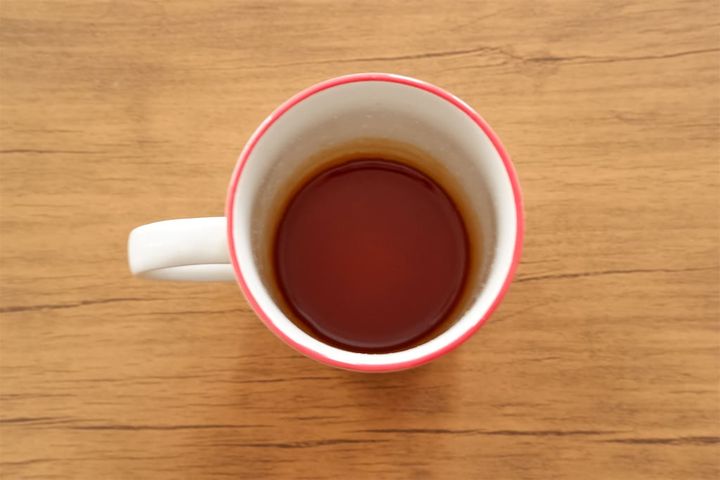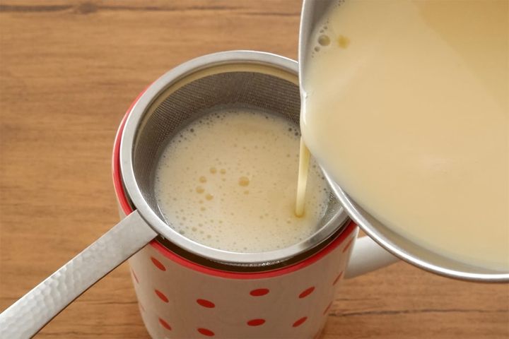 6. マグカップに茶こしを乗せ、5をこしながら入れる。なめらかな口当たりに仕上げるために、茶こしを使うのがポイントです。