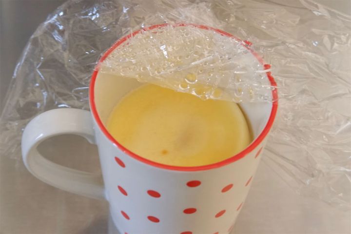 7. 6にラップをかけ、電子レンジで加熱する。レシピでは600Wで1分30秒とありましたが、合計2分10秒加熱しました。卵液の表面がふつふつしていたら、加熱を止めてOKです。