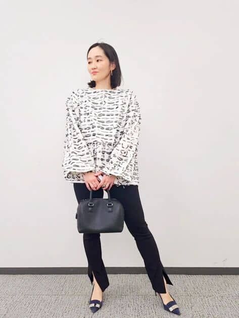入学式を意識した上品なホワイトトップスを主役にブラックのレギンスパンツで引き締めたスタイル。ペプラムのシルエットが腰回りをさりげなくカバーして華やかさも演出。ジャケットとパンプスのホワイトをリンクさせることで全体に統一感をプラスしました。プチプラなのに高見えするのも嬉しいポイント。