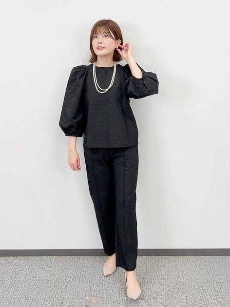 さりげないドット柄は一見無地のように見える程度の上品さ漂うトップス。盛り袖デザインが華やかさを添えて他と差がつくセレモニースタイルが完成します。パンツはウエスト調整可能で穿き心地も抜群なので普段使いも◎。肩幅が気になるときは縦長のアクセをプラスするとバランス良く仕上がります。