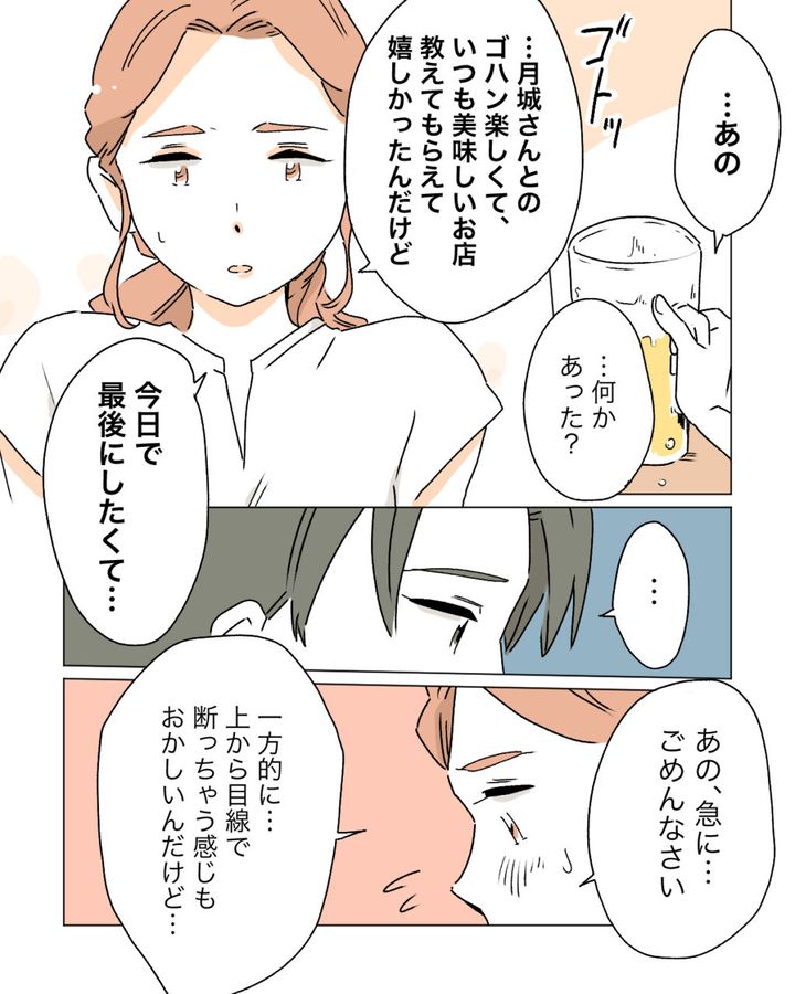 しばらく楽しく飲んだ後、私はジョッキを置いて「・・あの」と切り出しました。「・・何かあった?」と聞かれ、「・・月城さんとのゴハン楽しくて、いつも美味しいお店教えてもらって嬉しかったんだけど、今日で最後にしたくて・・」と伝えると、何も言わない月城さん。「あの、急に・・ごめんなさい。一方的に・・上から目線で断っちゃう感じもおかしいんだけど・・」と言葉を選びながら伝えました。