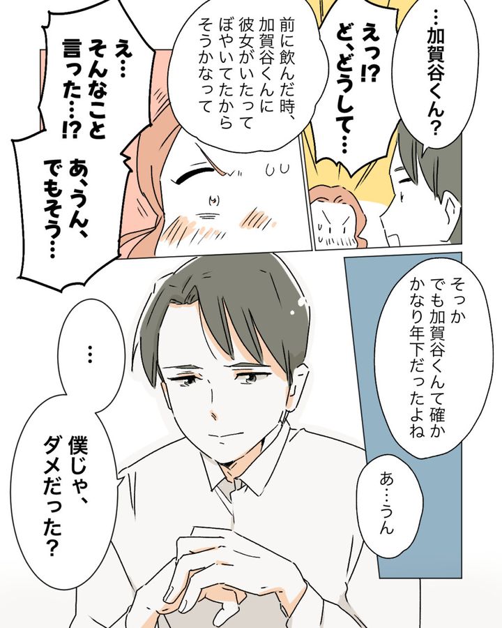 すると「・・加賀谷くん?」と言い当てられ「えっ!?ど、どうして・・」と焦る私。「前に飲んだ時、加賀谷くんに彼女がいたってぼやいてたからそうかなって」と言う月城さんの言葉に「え・・そんなこと言った・・?あ、うん、でもそう・・」と赤面してしまう私。月城さんにそんなことを話していたなんて・・恥ずかしい。そして、月城さんが「そっか。でも加賀谷くんて確かかなり年下だったよね」と言うので「あ・・うん」と答えると、少し考えるような間のあと「・・僕じゃ、ダメだった?」と言った月城さん。