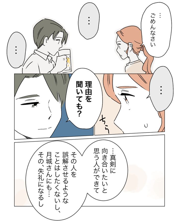 改めて「・・ごめんなさい」と伝えるも無言が続く月城さん。しばらく気まずい時間が流れ、ちらっと月城さんの顔を見ると「理由を聞いても?」と月城さんが静かに口を開きました。「・・真剣に向き合いたいと思う人ができて。その人を誤解させるようなことはしたくないし、月城さんにも・・その、失礼になるし」と正直に答えました。