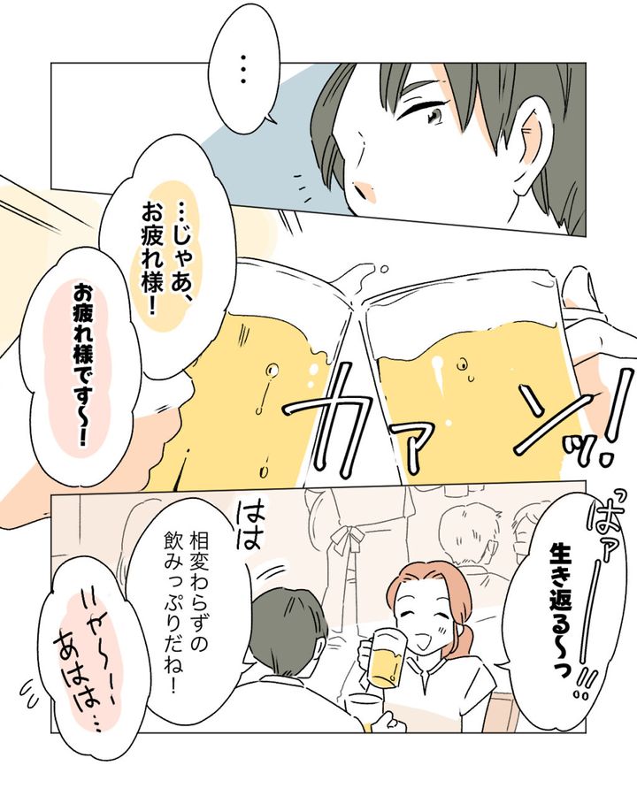 月城さんは既にこのとき私の様子がいつもと違うことに気づいていたかもしれない。お店に入り、「・・・じゃあ、お疲れ様!」「お疲れ様です~!」とまずは乾杯。「生き返る~っ」と勢いよく飲む私を見て「はは。相変わらずの飲みっぷりだね!」と笑う月城さん。