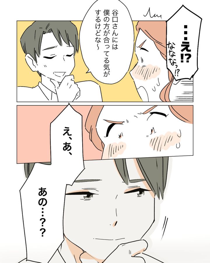 「・・え!?なななっ!?」予想外の月城さんの言葉に混乱してしまう私。さらに月城さんが「谷口さんには僕の方が合ってる気がするけどな~」と冗談っぽく言うので「え、あ、あの・・??」と言葉に詰まってしまう私。まさか月城さんがそんな風に思っていたなんて・・思ってもいませんでした。