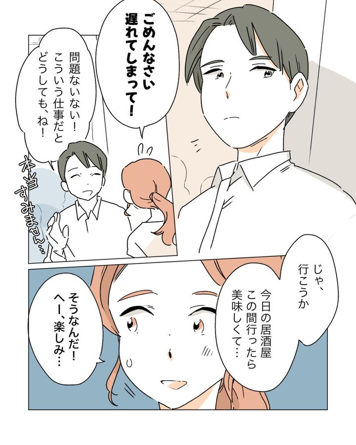 月城さんとの約束の日。仕事が長引き待ち合わせに遅れてしまった私。「ごめんなさい、遅れてしまって!」と謝る私に「問題ないない!こういう仕事だとどうしても、ね!」と私に気を遣わせないよう軽い感じで言ってくれる月城さん。「じゃ、行こうか。今日の居酒屋、この間行ったら美味しくて・・・」と言いながらお店に向かう月城さんに「そうなんだ!へー、楽しみ・・・」と返しながらも、この後伝えないといけないことを考えてソワソワしてしまう。