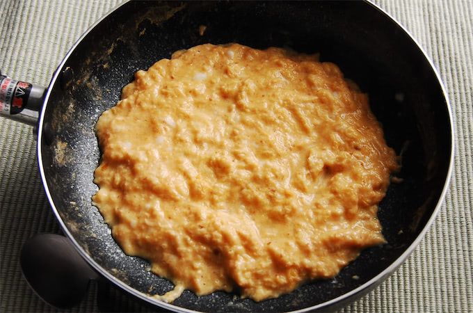 2. 小さめのフライパンに油を引き、強めの中火にかけ、油が温まったら1を投入し、先ほどと同じように、ヘラなどで卵液を中央に寄せながら、火を通します。