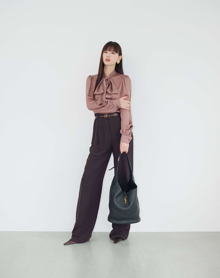 従来の「ル・サンカセット スープル」よりもやや縦長のフォルムを採用した、新作「ル・サンカセット ホーボー」。ソフトな質感でありながら自立するデザインで、物を入れても美しい形を保つ。ル・サンカセット ホ ーボー[H31.5×W26×D13.5]¥506,000、ブラウス¥308,000、パンツ ¥374,000、イヤリング¥88,000(参考価格)、ベルト¥92,400、靴¥165,000(参考価格)/以上サンローラン バイ アンソニー・ヴァカレロ (サンローラン クライアントサービス)