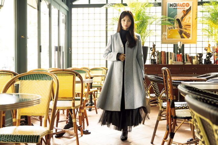 コート¥79,200/TOCCA(オンワード樫山 お客様相談室) ニット¥9,350/SNIDEL スカート¥25,300/ジャスグリッティー ピ アス¥37,400/ヴイエー ヴァンドーム青山(ヴイエー ヴァンドーム青山 有楽町マルイ店) バッグ ¥143,000/J&M デヴィッドソン(J&M デヴィッドソン カスタマーセンター) タイツ¥1,320/靴下屋(Tabio) シューズ¥25,300/モード・エ・ジャコモ(オギツ)