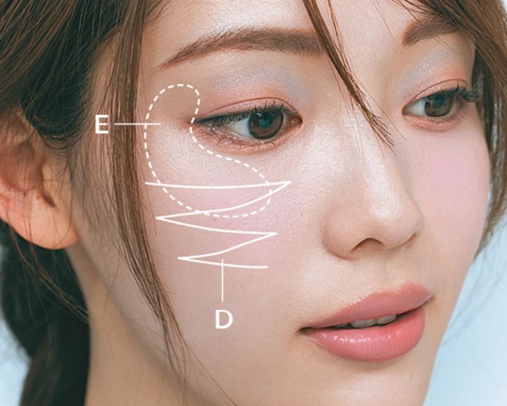 Dを指にとりほお全体に広くなじませる。Eをブラシで目尻からほお骨にかけて重ねる。