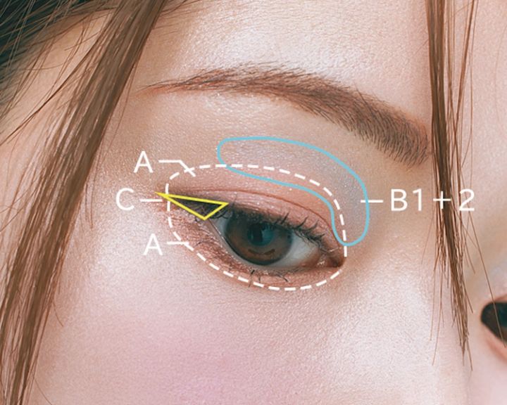 Aのピンクを上下まぶた全体に広くのせニュアンスづけ。B1+2を目頭のくぼみに沿って入れる。