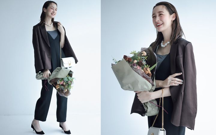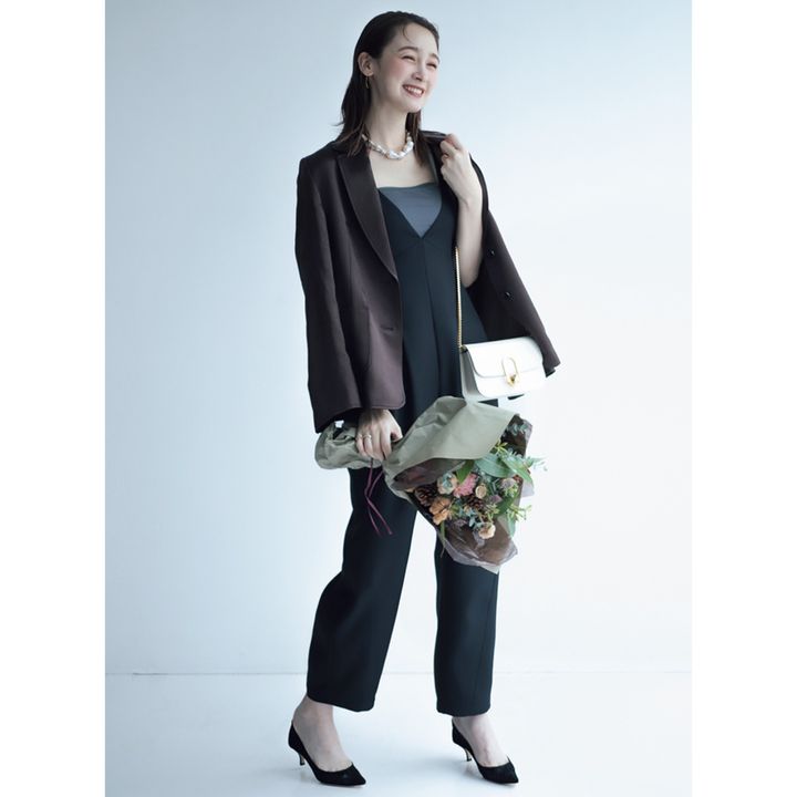 ジャケット¥25,300(ánuans)サロペット¥27,500(カデュネ/カデュネ プレスルーム)バッグ¥69,300(マエストソ/アマン)パンプス¥61,600(ネブローニ)ピアス¥132,000(マリハ)ネックレス¥19,800リング¥11,000(ともにステラハリウッド)インナー/スタイリスト私物
