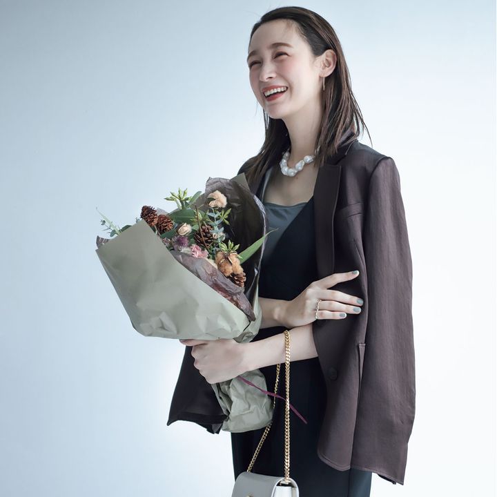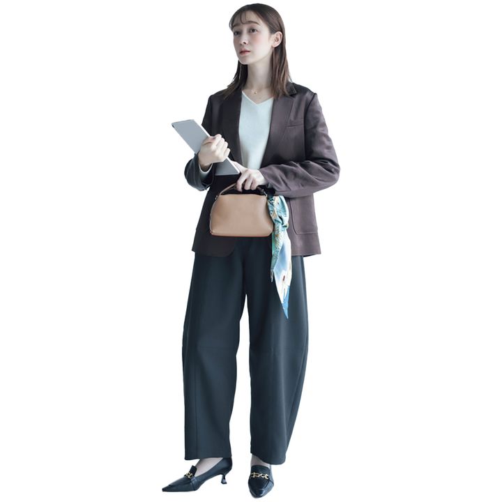 攻めのジャケットで、いつも通りが少しだけ華やかになる絶妙なバランス。仕事ができそう!な好印象に。ジャケット 左を着回し ニット¥18,700(Stola.)パンツ¥33,000(ドローイング ナンバーズ/ドローイング ナンバーズ 新宿店)バッグ[ショルダーストラップ付き]¥31,900(ジャンニ キアリーニ/ジャンニ キアリーニ 銀座店)パンプス¥25,300(オデット エ オディール/オデット エ オディール 新宿店)スカーフ¥15,400(マニプリ)ピアス¥110,000ネックレス¥85,800(ともにマリハ)