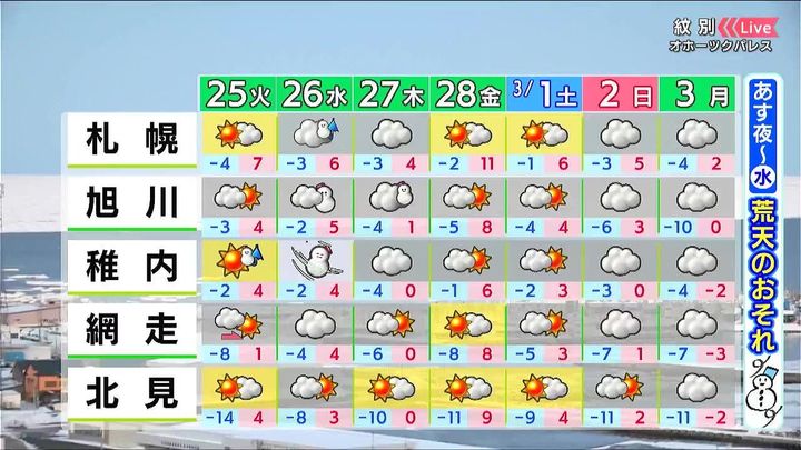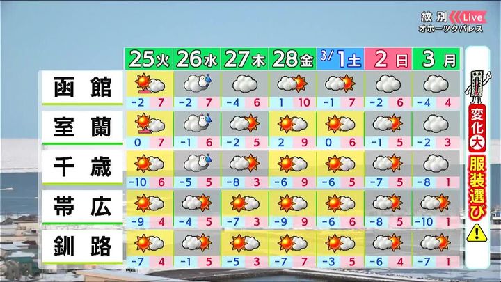 2月25日からの北海道の週間天気予報