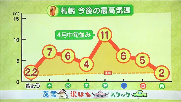 ただ、喜んでばかりはいられません。札幌は平年より積雪が多くなっているので、落雪事故や泥はね、ザクザク路面にタイヤがはまるスタックにも注意して下さい。