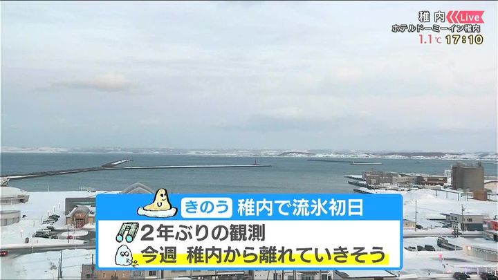 稚内地方気象台ではきのう23日、2年ぶりに陸地から流氷が初めて見られる流氷初日を観測しました。今週は流氷は稚内から少し離れていきそうです。