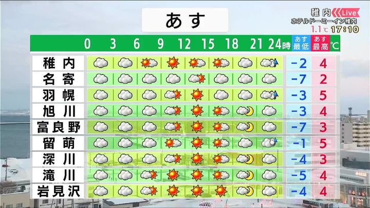 各地で日差しが出て、気温は4度前後まで上がるでしょう。夜は風が強まりますが、南風のため気温は下がらず、稚内や留萌では湿った雪になりそうです。