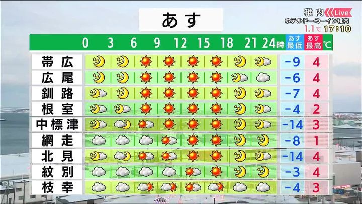 道東を中心に晴れるでしょう。上空の寒気が抜けるため、朝の冷え込みは弱まります。日中は網走で1度と12日ぶりにプラスの気温になるでしょう。