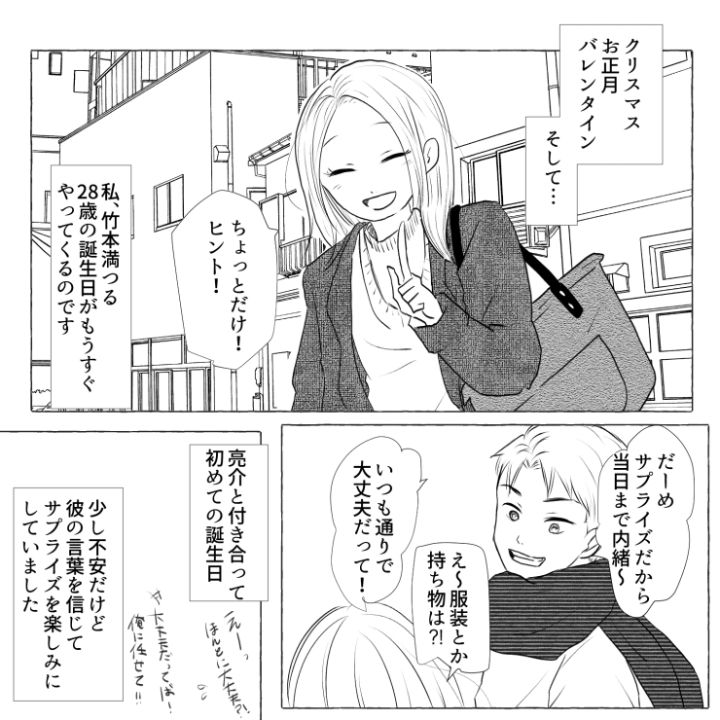 主人公はもうすぐ誕生日。彼氏と付き合ってから初めての誕生日ということもあり、彼氏も張り切ってサプライズを用意しているとのこと。しかし、このサプライズが2人の関係を悪化させることになるとは・・・・。