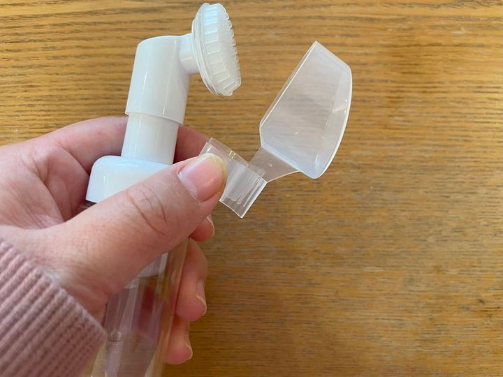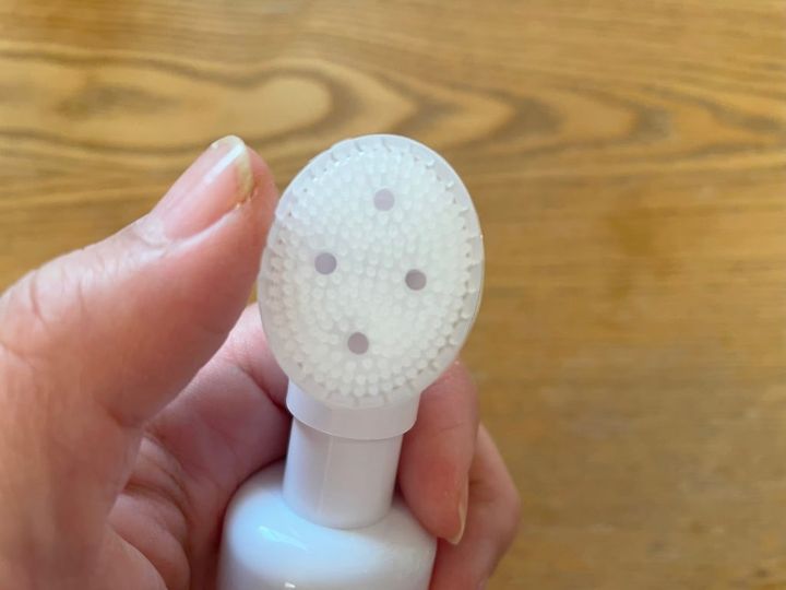 キャップを外すと…泡ポンプボトルの先端には柔らかいシリコーンブラシがついています。指で触ると気持ちがいいです。