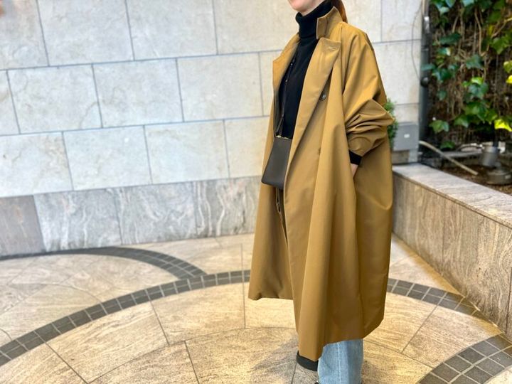 長身の清香さんがサラリと着こなすのは、立体的なフォルムが美しい「ジュライナイン」のコート。「このボリューム感がとっても気に入っています」。ゆったりとしたアームホールも美しいので、「袖口のボタンを調整すれば、こんなスタイルにも」。春先まで重宝しそうなカーキのスタンドカラーコートです。