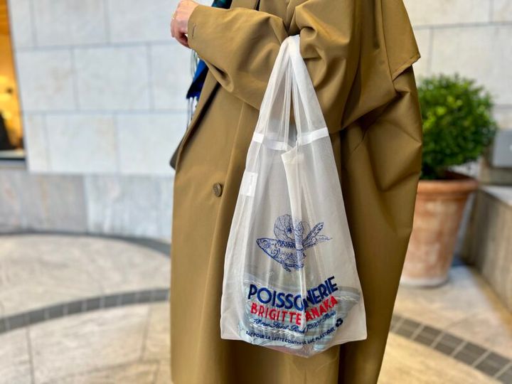 ショルダーバッグだけで身軽にショッピング中だった清香さん。「でも、エコバッグはいつも持ってますよ」と見せてくれたのは、「ブリジットタナカ」の刺繍入りオーガンジーバッグ。お友だちからのバースデイプレゼントなのだそう。