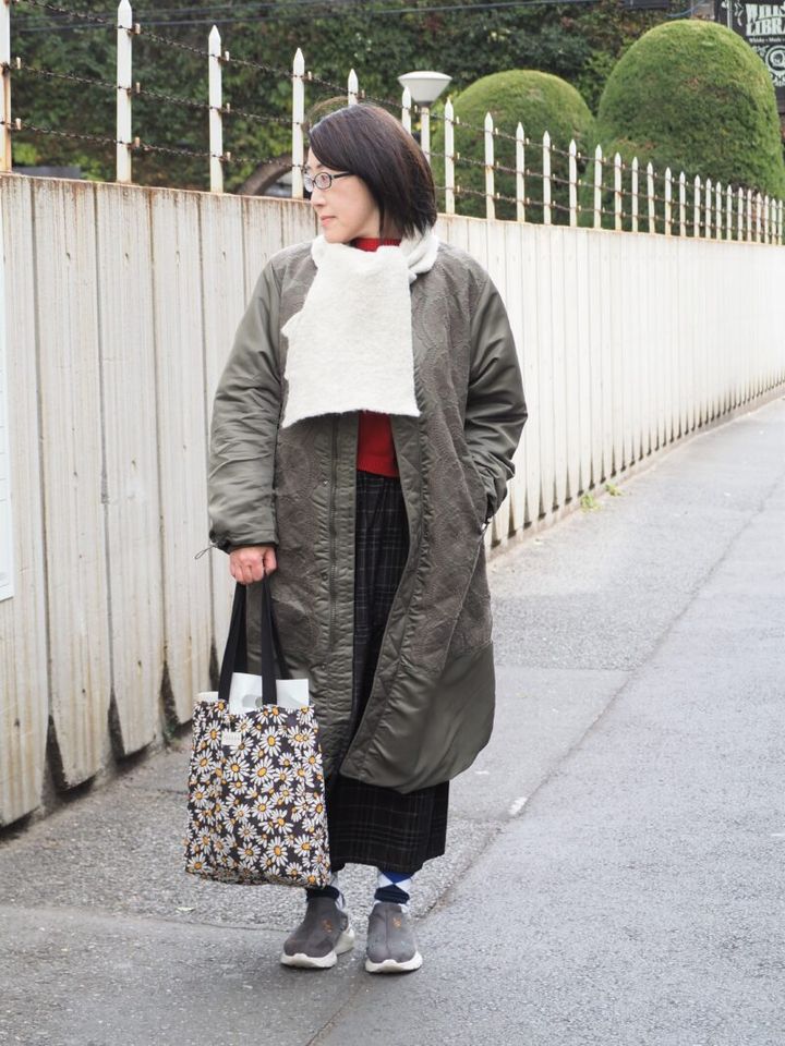 トラッド感のあるニットとチェック柄スカートの組み合わせは、カーキのロングコートを重ねてカジュアルに。「昨年購入した『ハク』のコートが今年も大活躍しています。ロング丈なので下半身も暖かい!」。コートの間から赤をちらりとのぞかせて、レディに決めて。