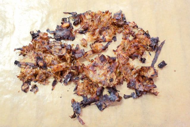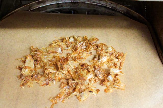 1. かつお節にしょうゆとみりんを加えて混ぜ、クッキングシートを敷いた天板に広げ、150℃のトースターで5分焼きます。