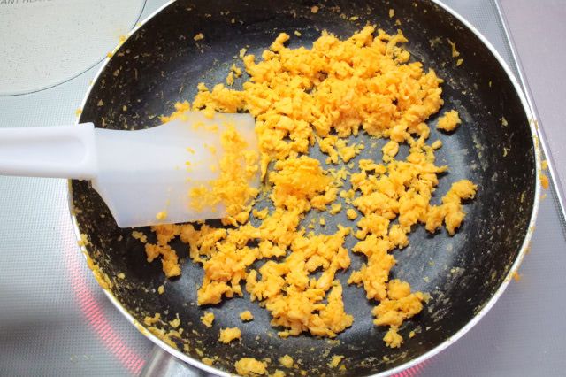 2. ボウルで卵と砂糖を混ぜ合わせ、ザルで濾します。弱火で熱したフッ素樹脂加工のフライパンに流し入れ、ポロポロとするまで炒めます。