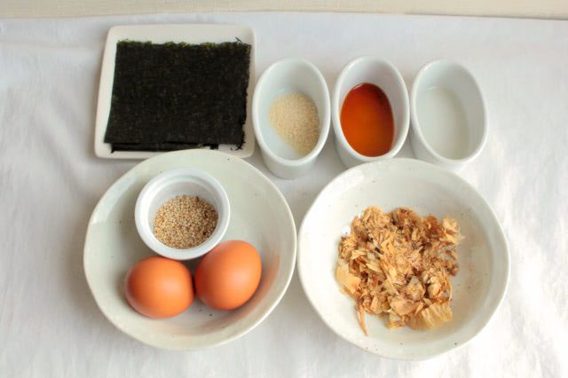 おまけに材料は、卵、のり、かつお節、白ゴマ、砂糖、しょうゆ、みりんの7つ。どれも常備しているものばかりなので、パパッと作ってみます。