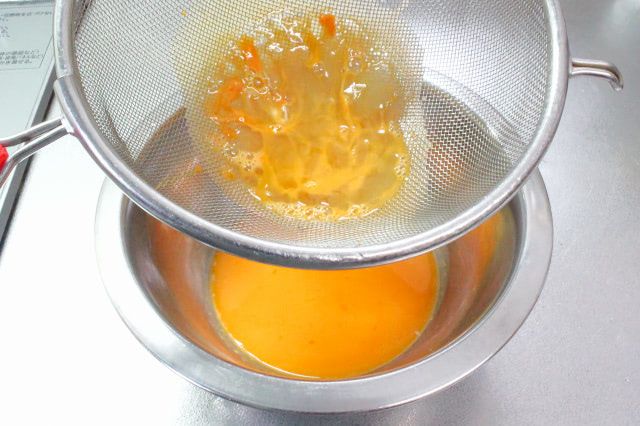 ザルで濾すと、混ざりきらなかった白身が!シリコンベラで押しながらザルを通し、もう一度、卵液をしっかりと混ぜました。ザルで濾すことで卵液が均一に混ざり、卵がふんわりと焼けますよ。