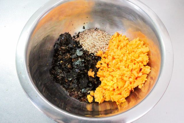 攪拌したかつお節と焼きのり、炒り卵、白ゴマを混ぜ合わせます。炒り卵がやわらかいので、混ぜ合わせると、しっとりとしたソフトな質感に。思ったよりも簡単に作れました♪