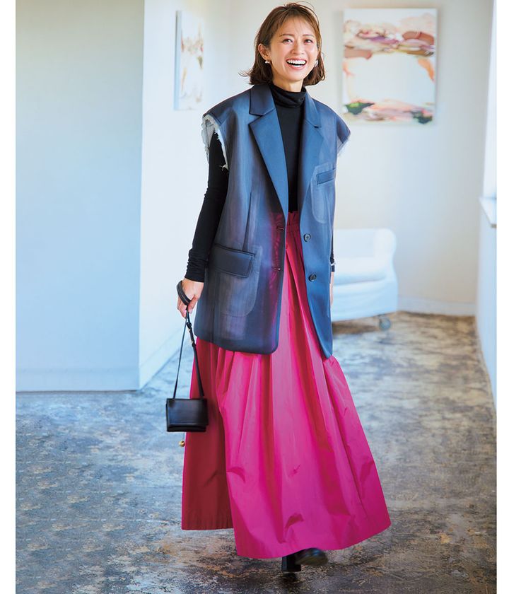 ショッキングピンクのスカートをメインに辛口ジレを。