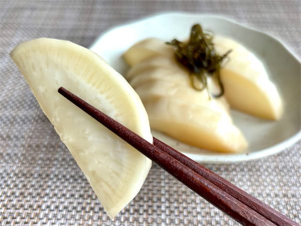 食感がちゃんとたくあんですね。最初の3日間、塩と砂糖に浸けることで水分が抜け、干したたくあんのような食感が再現されています。味については、市販の甘いたくあんとはちょっと違います。甘さは少なく、しっかりとした酸味と塩味、昆布のだしを感じます。色は薄いですが、中までしっかりと味が染みています。酢を効かせることで、発酵した漬け物のような味わいと、お酒のおつまみに合いそうな強めの塩味とだしの風味が、ご飯にもよく合い、おいしいです。ゆずの皮が口に入ると、爽やかな香りが口いっぱいに広がります。切り昆布はやわらかくなっていて食べやすく、昆布だけでもおいしいですね。