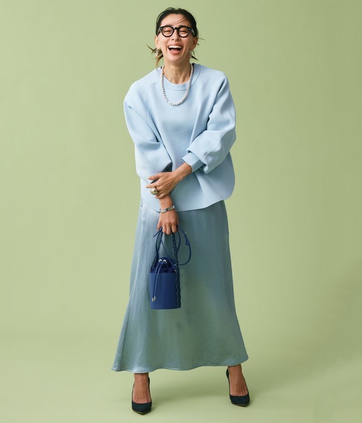 3位 春先取りワントーン!【くすみパステルニット】に艶スカートでメリハリを