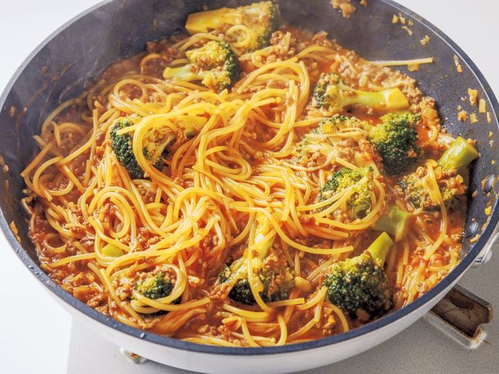 3. フライパン1つ・10分煮るだけ!簡単すぎる『ワンパンミートソースパスタ』のレシピ