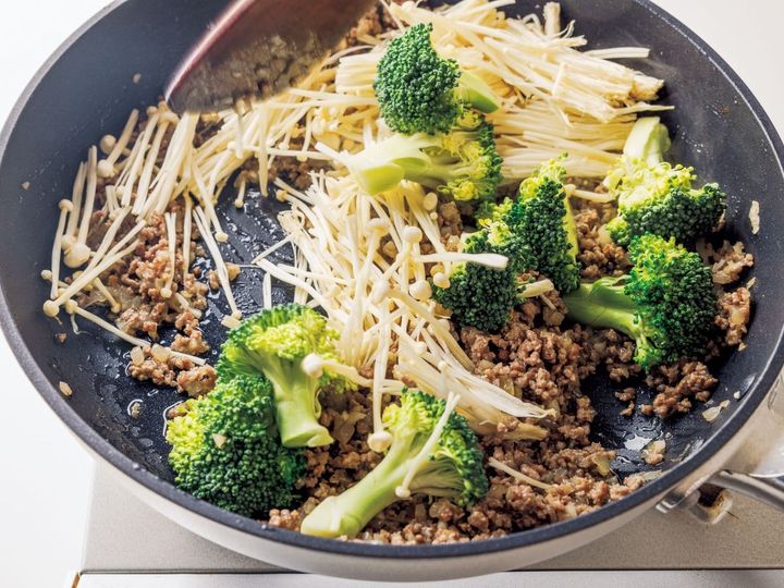 ほろっと柔らかいブロッコリーにちゅるんとしたえのき、存在感のあるひき肉で食べごたえばっちりです。