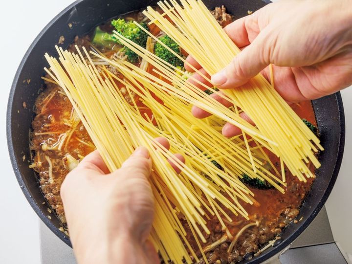 煮汁を加え、スパゲティを半分に折って広げ入れる。麺がくっつかないよう、菜箸でかるく混ぜながら煮立たせる。ふたをして弱火にし、10分ほど煮る(途中、全体を2~3回混ぜる)。
