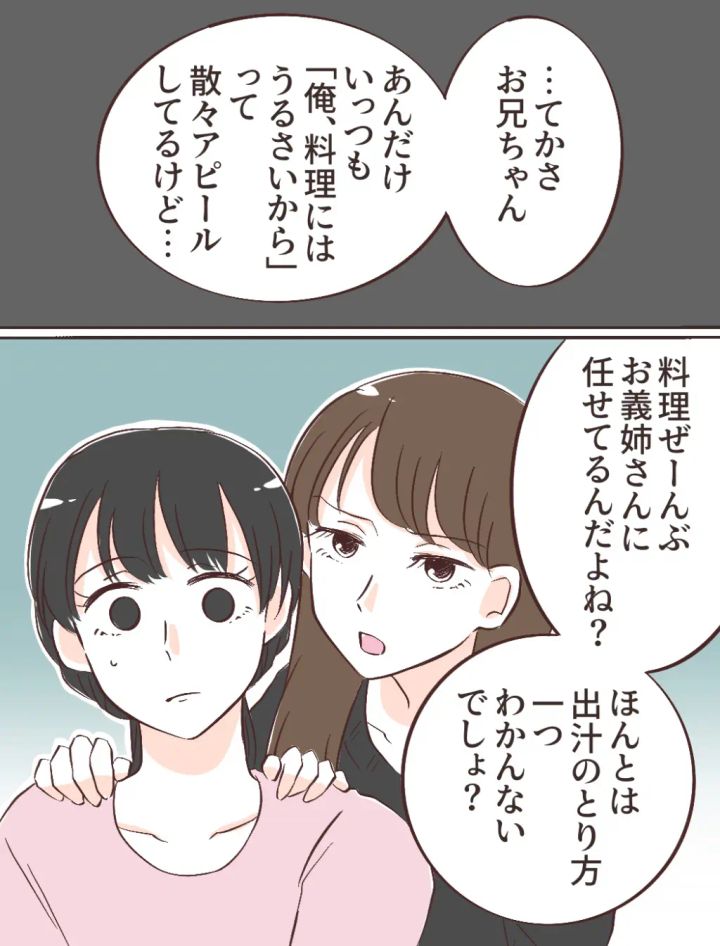 みのりさんは優奈さんの肩に触れながら「あんだけいっつも『俺、料理にはうるさいから』って散々アピールしてるけど・・・料理ぜーんぶお義姉さんに任せてるんだよね?ほんとは出汁の取り方一つわかんないでしょ?」と言いました。